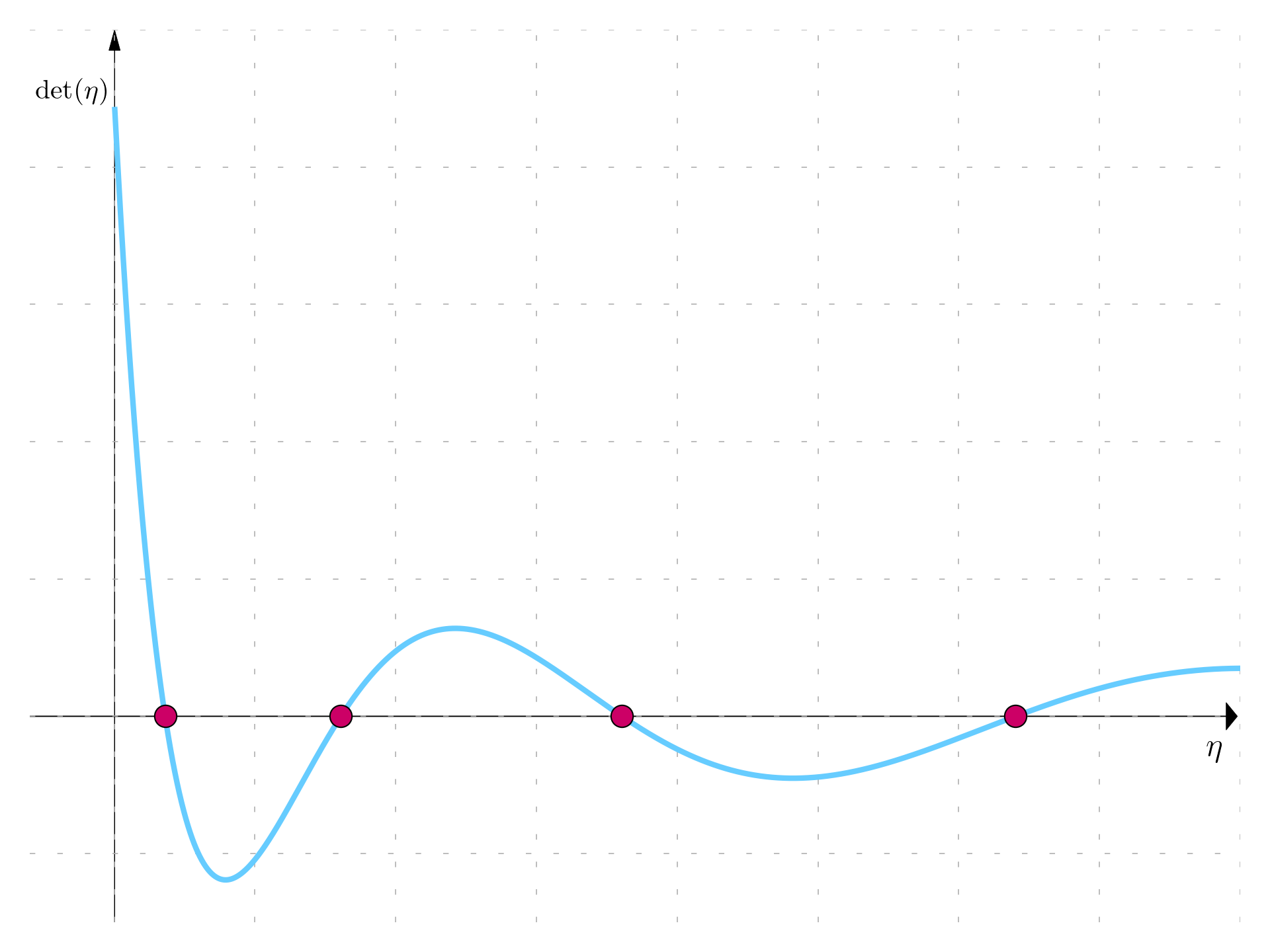 Considering a constant electric field f_0 = 3, the first step is to compute the roots of the determinant.